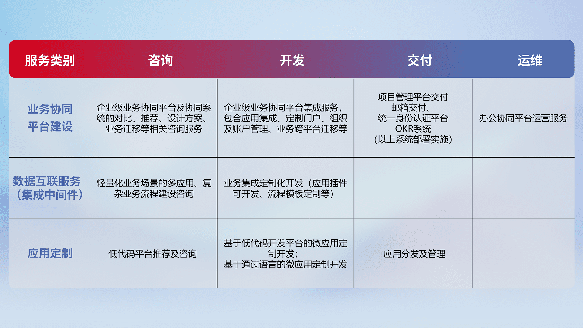 针对钉钉、、、、企微、、、IDaas等平台级产品提供产品的规划、、方案、、交付、、、定制化开发等服务,,,,实现如统一协同办公、、、智能客户服务、、、混合会议管理、、、、智能数据查询、、、、等业务场景,,,,实现数字化转型。。。